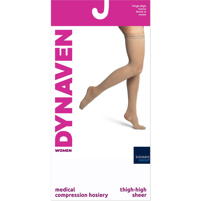 With a fashionable look and medical grade compression, this pair of thigh highs is the perfect, everyday sock to helps you look and feel great. The sheer fabric goes well with any outfit, and the reinforced toe and heel area offer better durability. Lace silicone grip top band helps you get them on easier and keeps them in place throughout the day. Moderate 15-20 mmHg graduated compression improves circulation and helps prevent and relieve tired, heavy, achy or swollen legs and leg discomfort from sitting or standing all day.